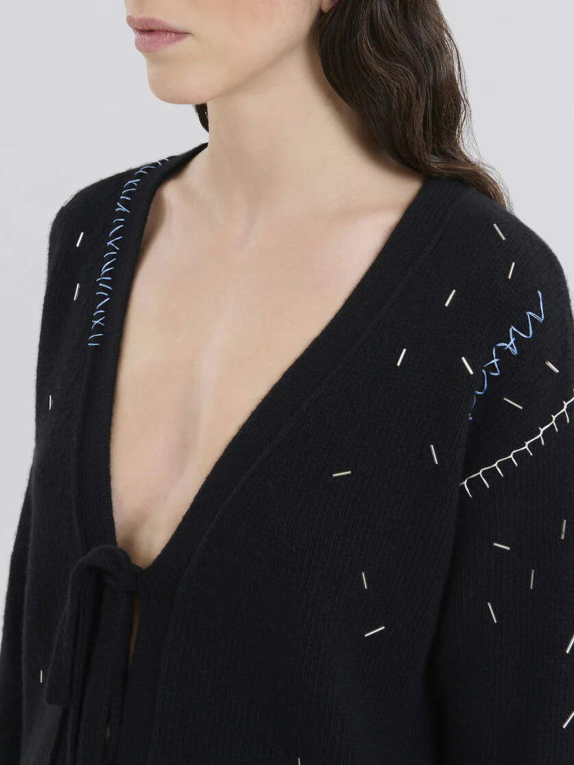 Wool and cashmere blend long sleeved cardigan embellished with tinted beads and embroidery. Ribbon ties at the front, and a hand embroidered Marni Symbol on the left shoulder. Made in Italy